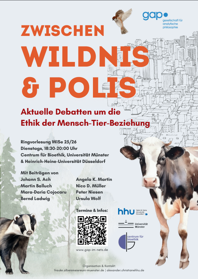 - Ringvorlesung WiSe 25/26: „Zwischen Wildnis und Polis – Aktuelle Debatten um die Ethik der Mensch-Tier-Beziehung“