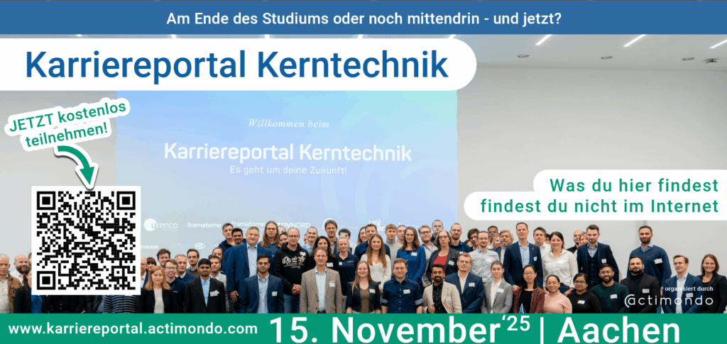Bereits im vierten Jahr in Folge öffnet das Karriereportal Kerntechnik am Samstag, 15. November 2025 (10–16 Uhr) diesmal in Aachen (Campus Eupener Straße) seine Türen für alle Studierenden (ab dem 2. Semester), Promovierenden und frühe Berufseinsteiger:innen, die sich für das Thema Kern- und Energietechnik interessieren. Als Netzwerkveranstaltung konzipiert bieten wir keinen Messebetrieb, sondern kurze Pitches mit Q&A, anschließend 1:1-Gespräche an Thementischen und Karrierecoaching – mit Führungskräften, in der Branche tätigen Wissenschaftler:innen und jungen Kolleg:innen. Das Angebot ist kostenfrei; die Plätze sind bewusst auf 100 begrenzt, damit die Atmosphäre familiär bleibt und echte Gespräche möglich sind.