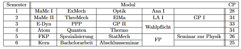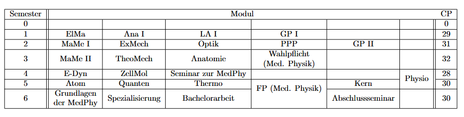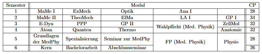 Für die Physik und die Medizinische Physik gibt es Musterstudienpläne. Wie der Name schon sagt handelt es sich um Muster, man muss sich also nicht unbedingt dran halten. In der Regel ist das natürlich trotzdem sinnvoll, für Auslandssemester etc. bietet es sich aber an die Module etwas herumzuschieben. Der Studienplan unterscheidet sich je nachdem, ob du im Winter (=Oktober) oder im Sommer (=April) anfängst.